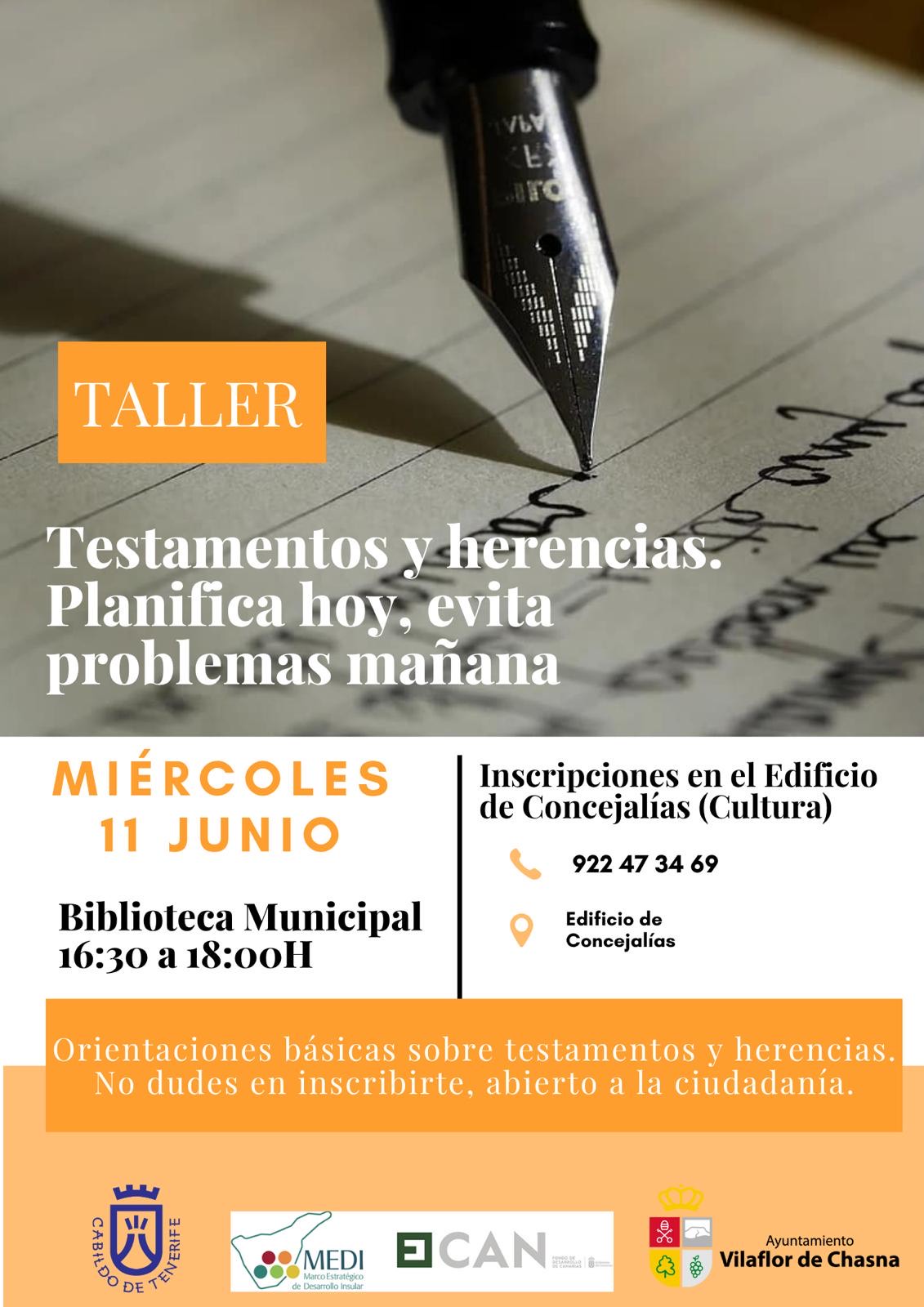 La Concejalรญa de Servicios Sociales del Ayuntamiento de Vilaflor de Chasna, en el marco de las actividades programadas en el ๐๐ซ๐จ๐ฒ๐ž๐œ๐ญ๐จ ๐๐ข๐ž๐ง๐ž๐ฌ๐ญ๐š๐ซ + ๐Ÿ๐ŸŽ๐Ÿ๐Ÿ“-๐Ÿ๐ŸŽ๐Ÿ๐Ÿ”, organiza un โ€œ๐“๐š๐ฅ๐ฅ๐ž๐ซ ๐ข๐ง๐Ÿ๐จ๐ซ๐ฆ๐š๐ญ๐ข๐ฏ๐จ ๐ฌ๐จ๐›๐ซ๐ž ๐ฅ๐š ๐ ๐ž๐ฌ๐ญ๐ขรณ๐ง ๐๐ž ๐ญ๐ž๐ฌ๐ญ๐š๐ฆ๐ž๐ง๐ญ๐จ๐ฌ ๐ฒ ๐ก๐ž๐ซ๐ž๐ง๐œ๐ข๐š๐ฌ. Planifica hoy, evita problemas maรฑanaโ€ que se llevarรก a cabo el ๐ฆ๐ขรฉ๐ซ๐œ๐จ๐ฅ๐ž๐ฌ ๐Ÿ๐Ÿ ๐๐ž ๐ฃ๐ฎ๐ง๐ข๐จ de 2025 ๐š ๐ฅ๐š๐ฌ ๐Ÿ๐Ÿ”:๐Ÿ‘๐ŸŽ๐ก en la ๐๐ข๐›๐ฅ๐ข๐จ๐ญ๐ž๐œ๐š ๐ฆ๐ฎ๐ง๐ข๐œ๐ข๐ฉ๐š๐ฅ ๐๐ž ๐•๐ข๐ฅ๐š๐Ÿ๐ฅ๐จ๐ซ ๐๐ž ๐‚๐ก๐š๐ฌ๐ง๐š.