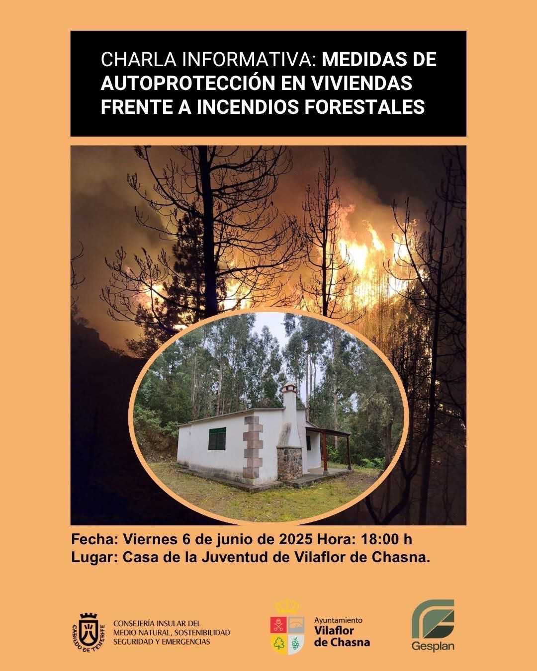 La Consejería de Medio Natural y Sostenibilidad Cabildo de Tenerife junto con el Ayuntamiento de Vilaflor de Chasna invita a todos los vecinos y vecinas a participar en una charla informativa sobre las medidas de autoprotección en viviendas frente a incendios forestales.