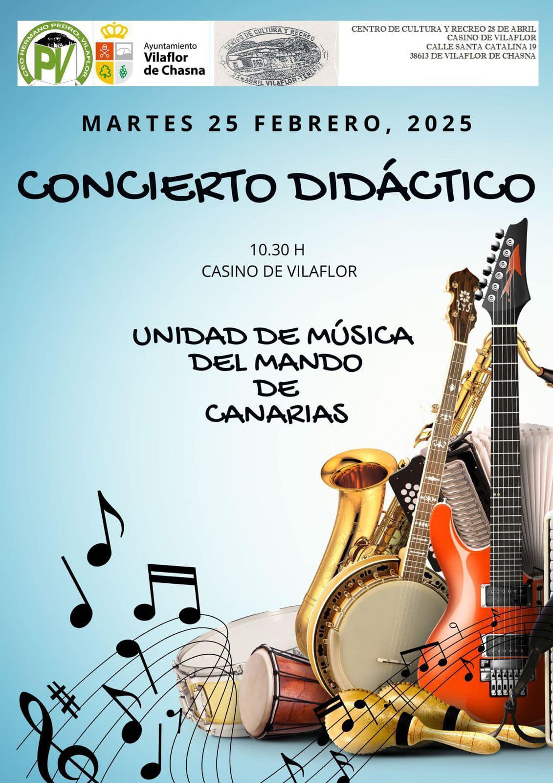 El Ayuntamiento de Vilaflor de Chasna, en colaboración con el Ceo Hermano Pedro Vilaflor y el Centro de Cultura y Recreo 25 de abril, les invita al Concierto didáctico que ofrecerá la Unidad de Música del Mando de Canarias, que tendrá lugar el próximo martes 25 de febrero de 2025 a las 10:30 horas en el Casino de Vilaflor. Una gran oportunidad para disfrutar de la música en familia.